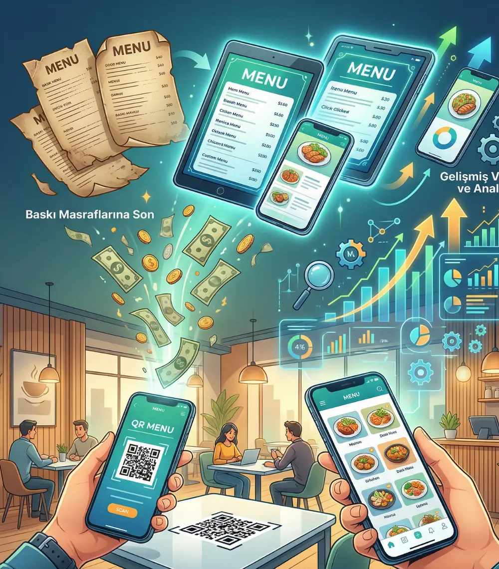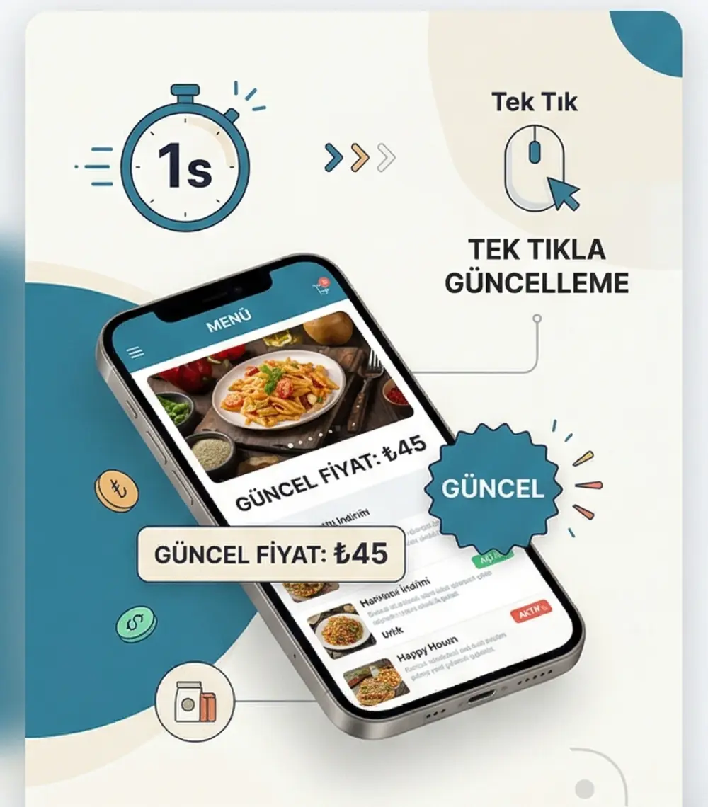 Klasik kağıt menü maliyetlerinden kurtulun. Müşterileriniz masalarındaki QR kodu okutarak saniyeler içinde zengin içerikli güncel menünüze ulaşsın, siparişlerini kolayca versin.